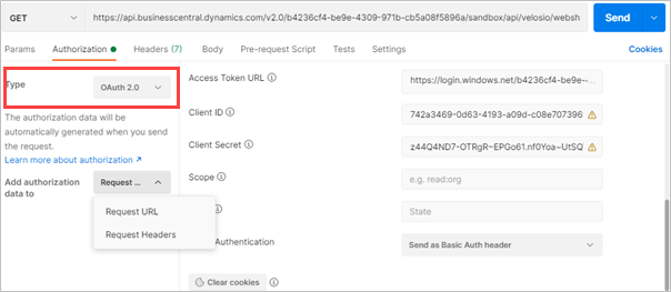 Access Token URL - https://login.windows.net/TenantID<GUID>/oauth2/token?resource=https://api.businesscentral.dynamics.com