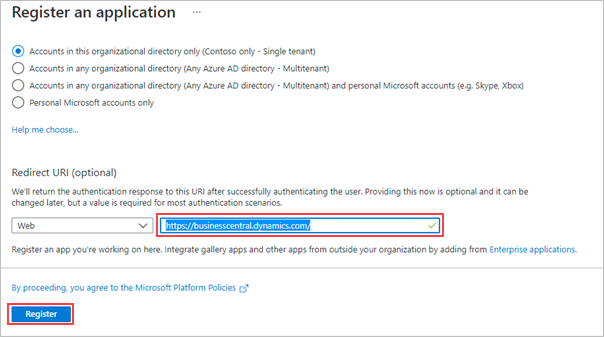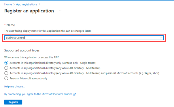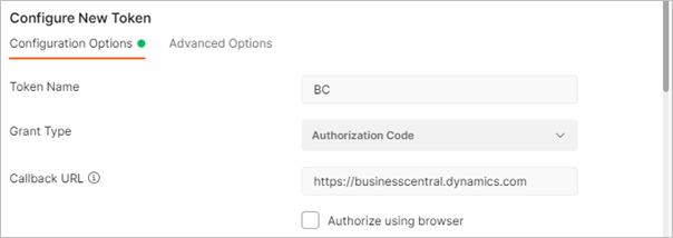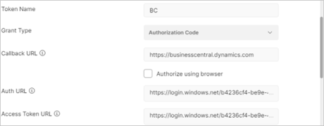 Token Name - Provide the value entered while App Registration. For example, Business Central.