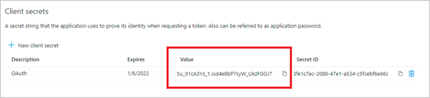 Copy the client secret generated under Value field in the Client secrets screen.