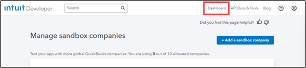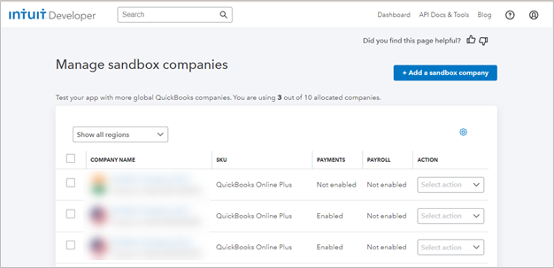After logging in, the Manage sandbox companies screen is displayed.
