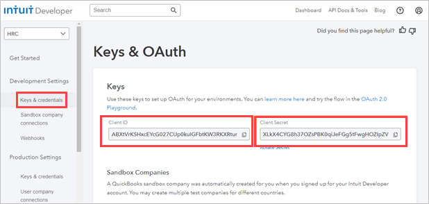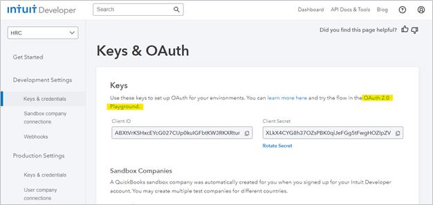 The Keys & OAuth screen is displayed with Client ID and Client Secret details. In this case, the Client ID is ABXtVrKSHxcEYcG027CUp0kuIGFbtKW3RKXRtunbRxgDbYa70A, and the Client Secret is, XLkX4CYG8h37OZsPBK0qiJeFGg5tFwgHOZIpZVQJ.