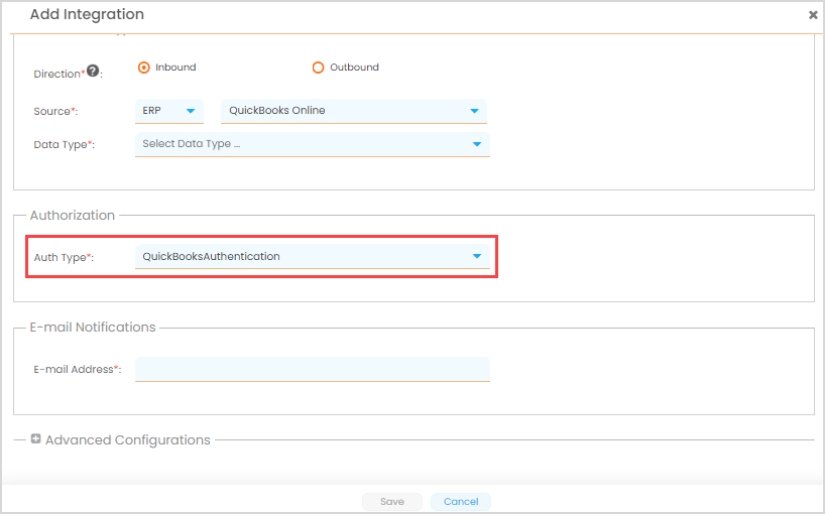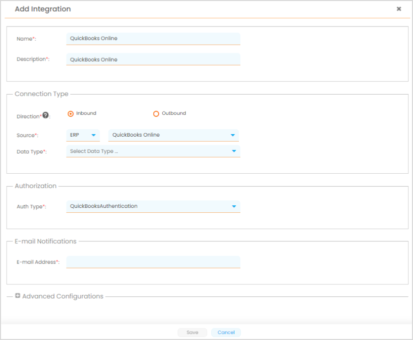 The Add Integration window allows you to provide the ERP Integration details for QuickBooks Online.