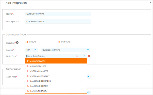 Selecting Inbound Integration displays ARINVOICEOPEN, ARINVOICECLOSE, CSUTOMERMASTER, CUSTOMERCONTACT, SALESINVOICEHEADER, SALESINVOICEITEM, and PAYMENTHISTORY as the options in the Data Type drop-down list.
