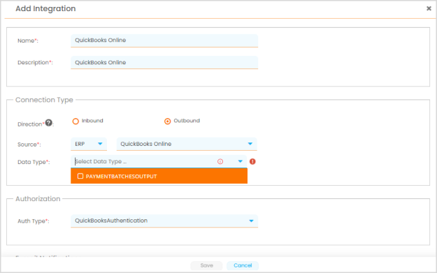 Selecting Outbound Integration displays PAYMENTBATCHESOUTPUT in the Data Type drop-down list.