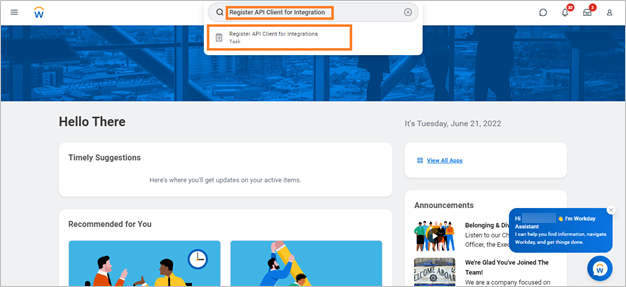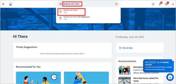 From the Workday portal, search and select Register API Client for Integrations from the Search bar.