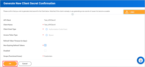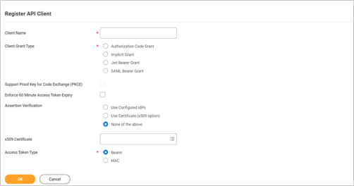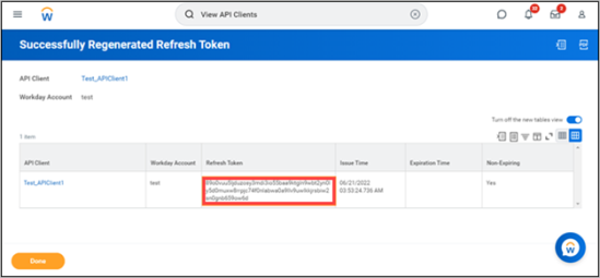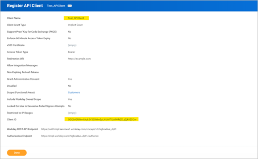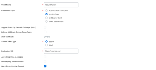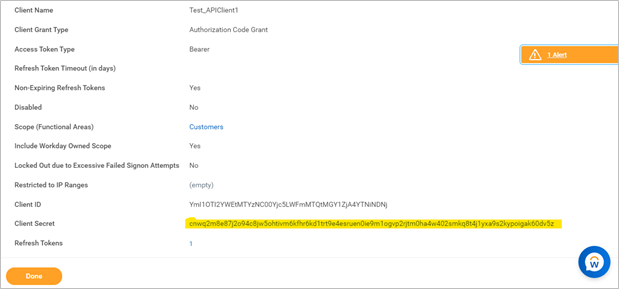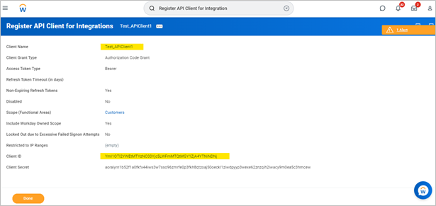 Workday generates an API Client for Integrations with an Authorization Code Grant client grant type, Bearer access token type, unique Client ID, and Client Secret.