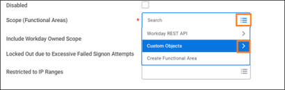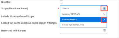Select the functional areas enabled by Workday for the REST API and the custom object domains that require access.