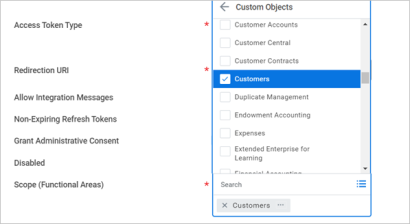 Select the functional areas for the OAuth 2.0 clients to access in the Scope (Functional Areas) field.