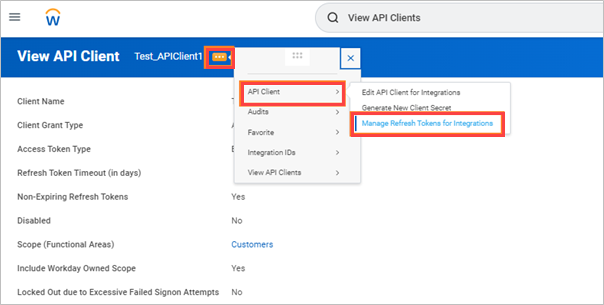 Navigate to the meatball icon displayed in the top menu of the Register API Client for Integrations screen > API Client > Manage Refresh Tokens for Integrations.