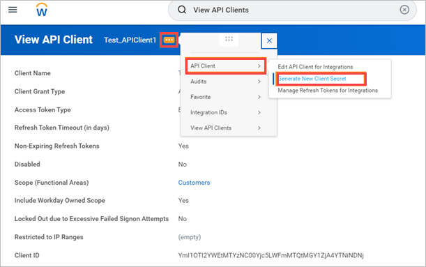 Navigate to the meatball icon displayed in the top menu of the Register API Client for Integrations screen > API Client > Generate New Client Secret.