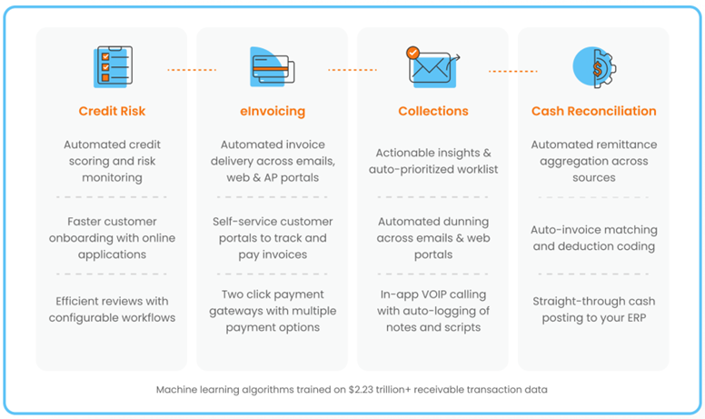 RadiusOne AR Suite (R1AR) is a solution platform that combines all receivable and payment modules into a unified business process to optimize accounts receivable operations. It includes a set of intelligent automation solutions to simplify AR processes, including e-invoicing, payments, collections, cash reconciliation, and credit risk management. The solution, designed exclusively for mid-sized businesses, puts your AR on auto-pilot, allowing your finance team to focus on what matters most. It can be deployed in less than four weeks and helps automate labor-intensive processes, maximize working capital, and enable faster cash conversion. With seamless integration with popular ERPs, RadiusOne AR Suite is the perfect solution for those looking for an easy-to-build, out-of-the-box solution without borrowing support and time from the IT team.
